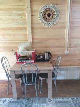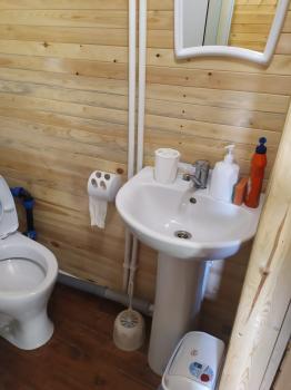 В номерах на 1 этаже : 2-х-спальная кровать (либо удобный диван-софа) , 2-х-ярусная кровать (подходит для взрослых), стол, стулья, шкаф для одежды, посуда, постельные принадлежности, по 2 полотенца на каждого, плитка, чайник, холодильник, фен, обогреватель. Удобства рядом с номером, на этаже: душевая кабина, раковина, титан, унитаз.