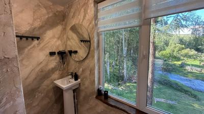 - Санузел с душем и окном, из которого открывается умиротворяющий вид.