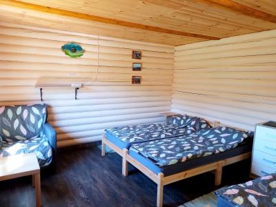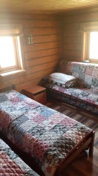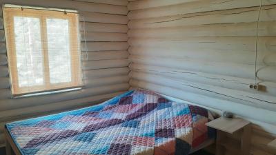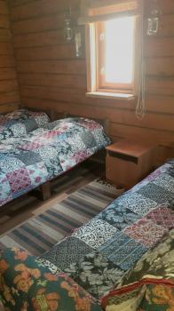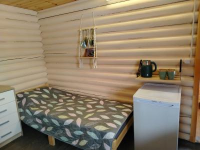 В спальне три односпальные кровати 80х200 см с очень удобными матрасами, комод, холодильник, чайный уголок, прикроватные столики, кресло, табуретки, зеркало, вешалки и розетки на 220В. Дома оборудованы обогревателями.