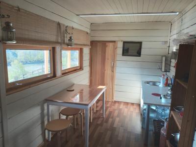 В кухне-гостиной с панорамным окном на Катунь расположена кухонная зона со всем необходимым для приготовления еды, холодильник, а также обеденная зона и релакс-уголок с мягкими пуфиками. Обогреватель и печь-камин согреют в прохладные осенние ночи. Есть розетки 220В (только для зарядки гаджетов).