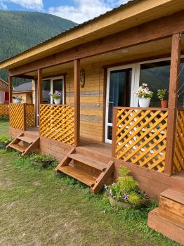 домиках с панорамными окнами и большими террасами, со всеми удобствами. Домик 24 км.м. Во всех домиках имеется централизованное отопление. Мобильный интернет, в шаговой доступности кафе "Домашняя кухня", кафе "Аура".