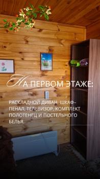 - на 2-ом этаже двуспальная кровать (спальное место 160*200), раскладной диван(спальное место 140*2000), кресло кровать(спальное место 90*200), телевизор до 20 каналов, доступ в интернет, пастельное белье, полотенце комплект из 3шт по 2 комплекта. Для 2 этажа душ, туалет рядом стоящее здание (мыло, туалетная бумага, гладильная доска, утюг, сушилка для белья)