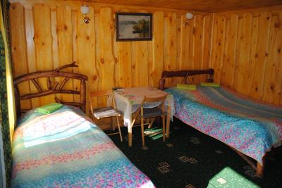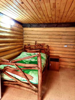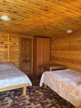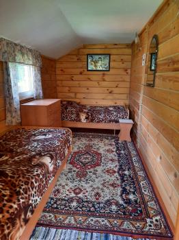 Однокомнатный номер на втором этаже. Сверху открывается красивый вид на горы, хвойный лес вокруг и на территорию приусадебного участка.