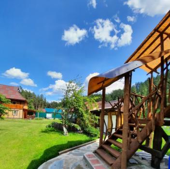 Однокомнатный номер расположен на втором этаже. Сверху открывается красивый вид на горы, хвойный лес вокруг и на территорию приусадебного участка.