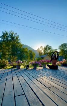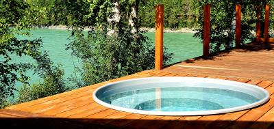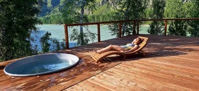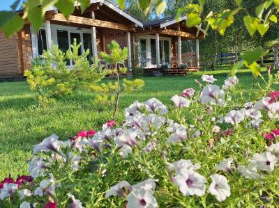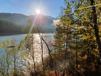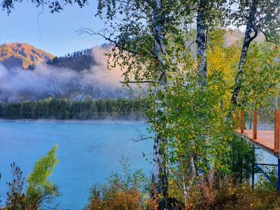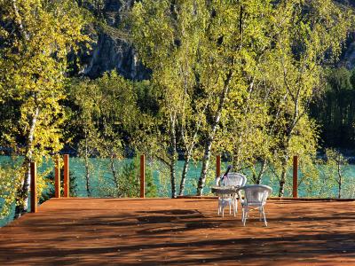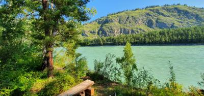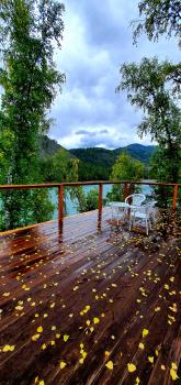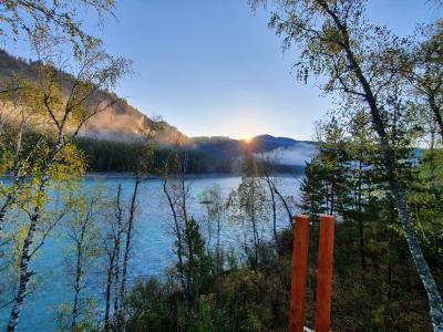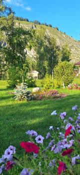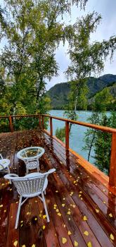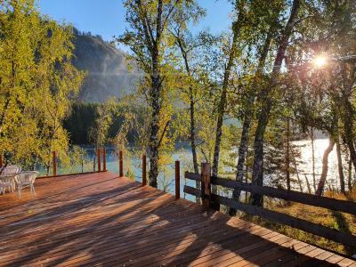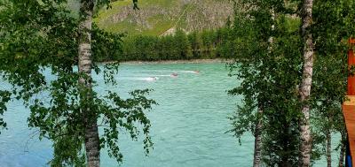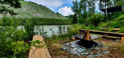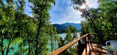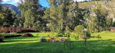 С территории открывается восхитительный вид на Катунь и горы, на которых пасутся горные козлы. Можно спуститься к воде и половить хариуса, покормить уточек или просто посозерцать и послушать шум воды.