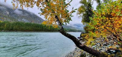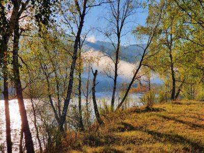 Мы находимся прямо на берегу Катуни. Перед нами река, за нами лесок, рядом никого, за оградой только горы, простор, лошадки и коровки.