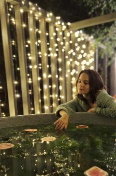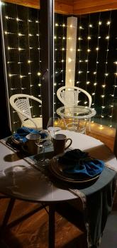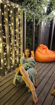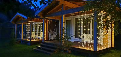 У каждого дома - своя большая терраса с качелей и мебелью для отдыха и перекуса на свежем воздухе, 2 варианта освещения (верхний свет и гирлянда).