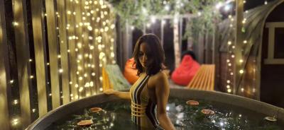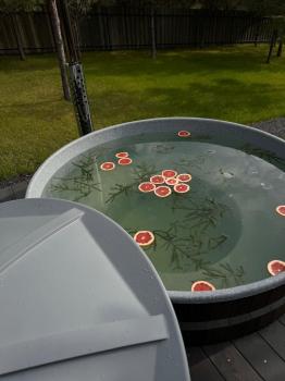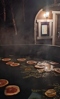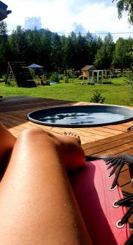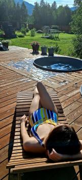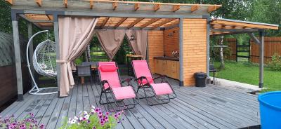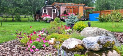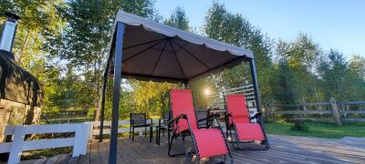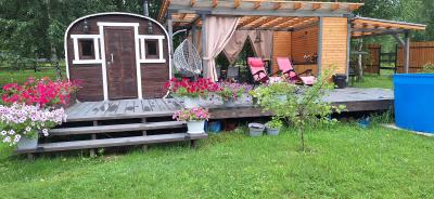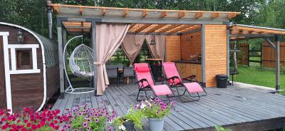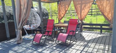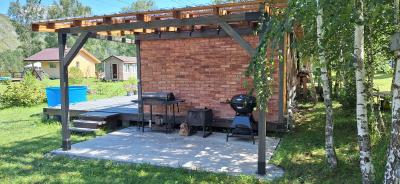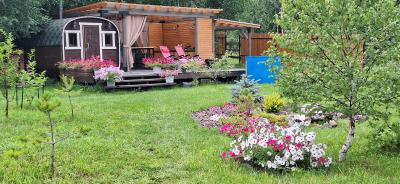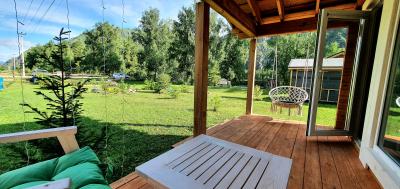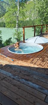На территории есть большая баня-бочка с купелью, большой террасой, фурако, кухонная зона, беседка-пергола с мебель для расслабления и отдыха после парной или просто для отдыха на свежем воздухе. Имеется мангальная зона, костровая зона с видом на Катунь, спуск к воде, видовая терраса над Катунью.