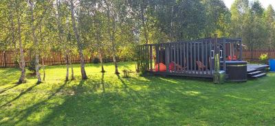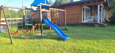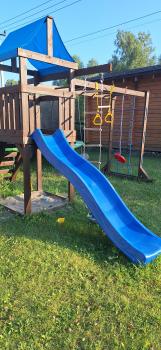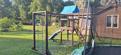 Для ребятишек сделана песочница, установлен большой батут, лазательный уголок и качели.