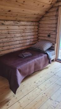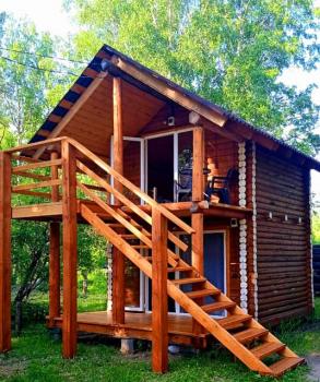 - Один двухэтажный домик площадью 32 кв.м (5 основных мест + 1 доп за дополнительную плату). Панорамные окна, терраса. Туалет, умывальник в доме. От 6000 р. дом.