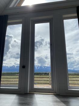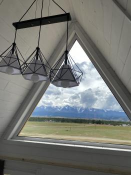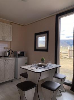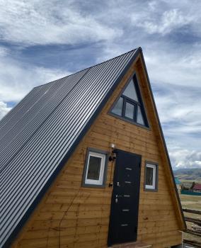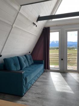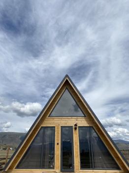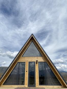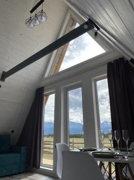 А-фрейм с панорамными окнами на гору Актру, все удобства - душ, микроволновая печь, холодильник, плитка, все столовые приборы (вилки, ложки, кострюли, сковорода, ножи, кружки, тарелки, супницы и т.д.)
