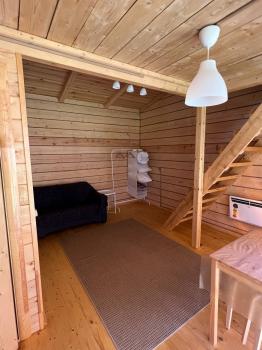 Двухэтажный. Двуспальная кровать, односпальная кровать, раскладной диван (доп. место), кухонная зона, холодильник, wifi, фен, обогреватель, полотенца, своя терраса.