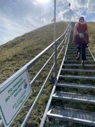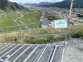 К смотровой площадке на гору Каскак туу ведет лестница с 665 ступеньками. Подъем требует, конечно, физических усилий, но зато вы посмотрите на Усть-Кан с высоты. Увидите петли реки Чарыш и слияние рек Кан и Чарыш. На подъеме установлены лавочки для отдыха.