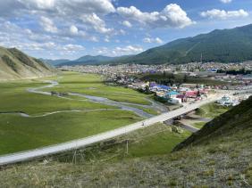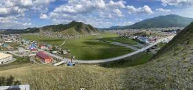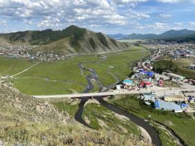 С обзорной площадки открывается вид на Усть-Кан, реку Чарыш, окружающие горы.