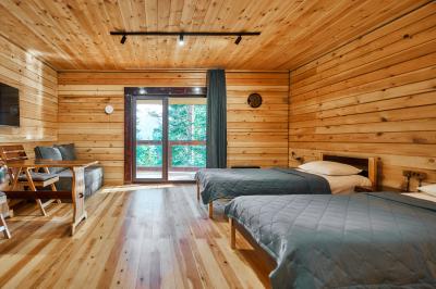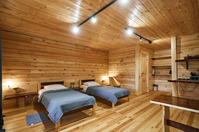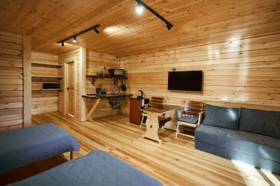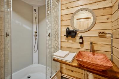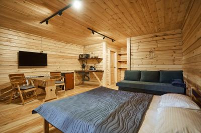 Кровать с ортопедическим матрацем и отельным белоснежным бельем страйп-сатин. Подушки и одеяла из искусственного лебяжьего пуха. На кухне столешница из массива кедра, варочная индукционная поверхность и посуда для нее, микроволновая печь, холодильник, столовые приборы, эл. чайник, немецкая глубокая раковина из нержавеющей стали с лотком для овощей и фруктов, дозатор с моющим средством. В санузле столешница из массива кедра, раковина – чаша с донным клапаном, дозатор с жидким мылом, набор больших плотных махровых полотенец на двух гостей, душевая кабина, унитаз. Все смесители качественные, Gappo. Стулья и обеденный стол из массива дерева и два шезлонга с подушками.
