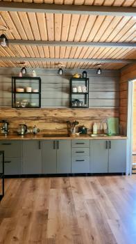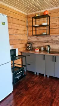 - большая кухня-гостиная с телевизором, плитой, микроволновкой, чайником, кофеваркой и посудой;