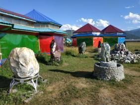 Во дворе музея находится большая экспозиция. Здесь стоят отполированные каменные глыбы. Камням придана форма пламени с острым верхом и глыбы смотрятся как произведение искусства.