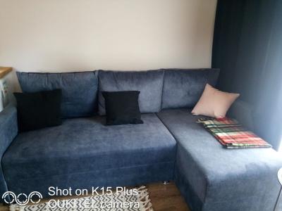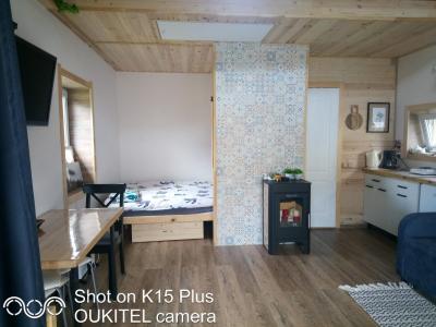 На 1 этаже расположена 2х спальная кровать и диван, стол, стулья, кухонная зона, туалет, душ.