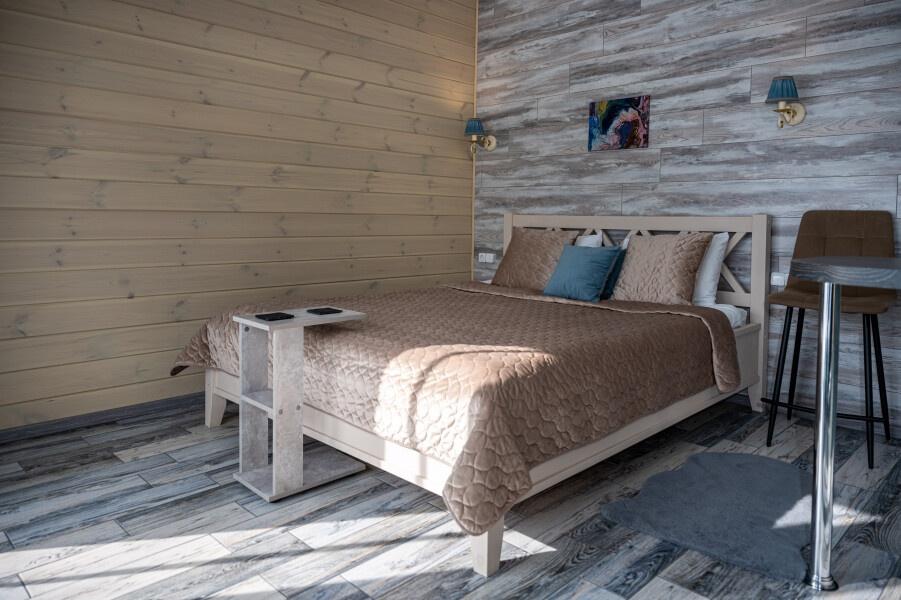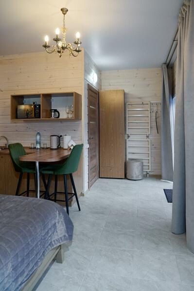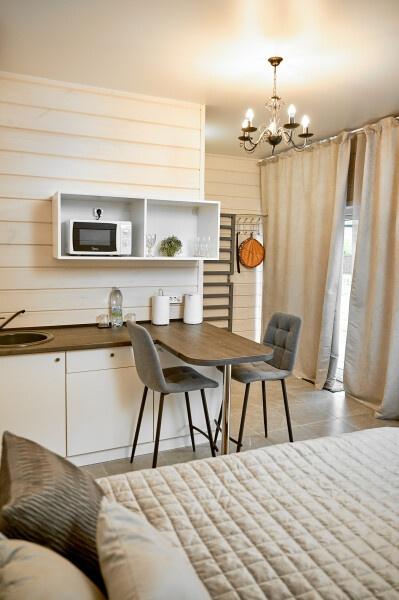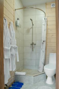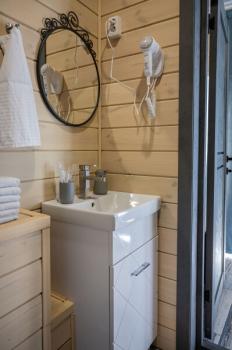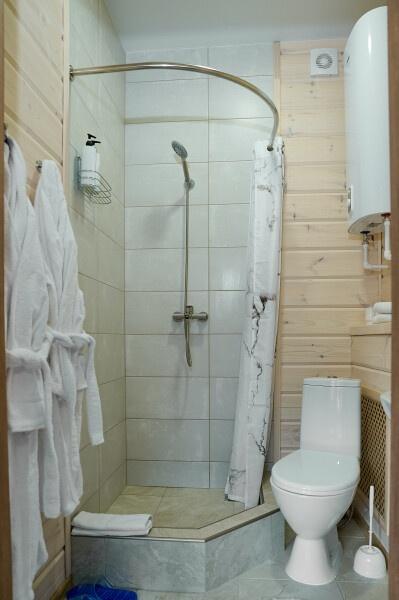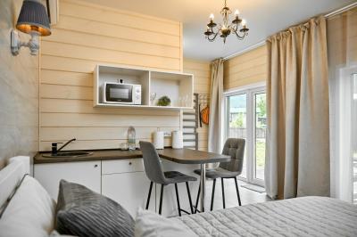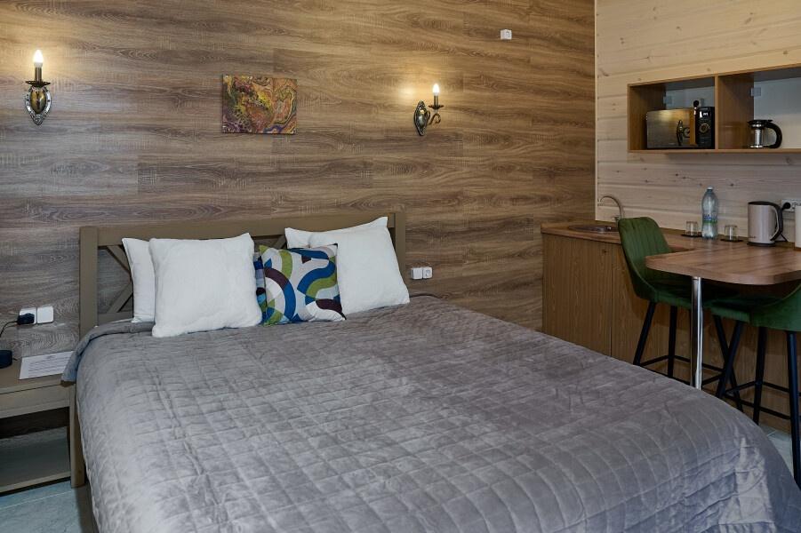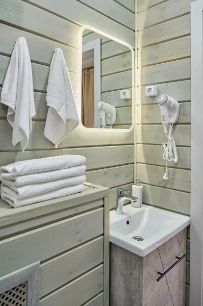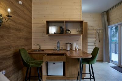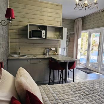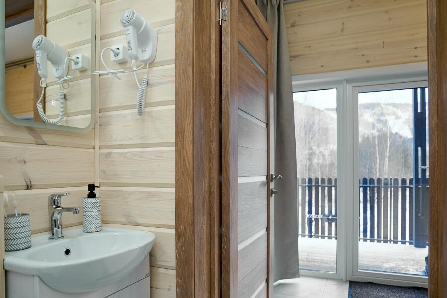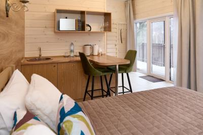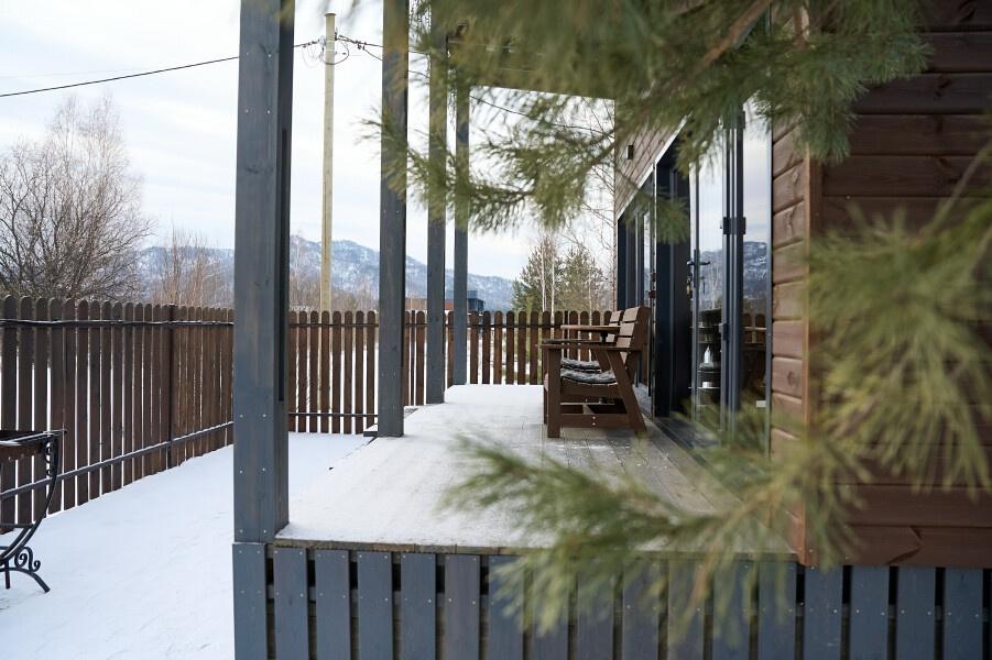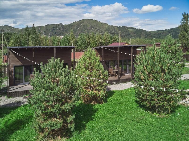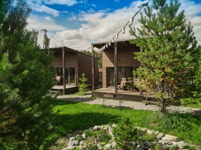 Для размещения отдыхающих предлагаются отдельно стоящие одноэтажные круглогодичные гостевые домики с панорамными окнами и верандами, с которых открывается прекрасный вид на горы как летом, так и зимой. В каждом домике есть санузел с душевой кабинкой, мини-кухня.