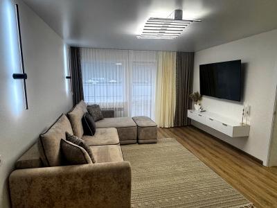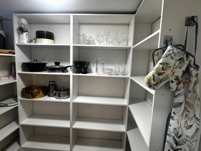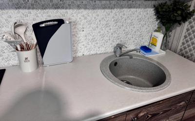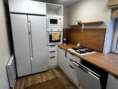- кухня, со всей кухонной утварью: холодильник, микроволновая печь,духовой шкаф, электрическая сенсорная плита (4 комфорки), телевизор, большой стол, стулья, чайник.