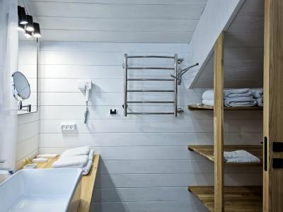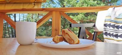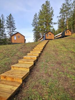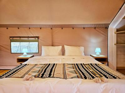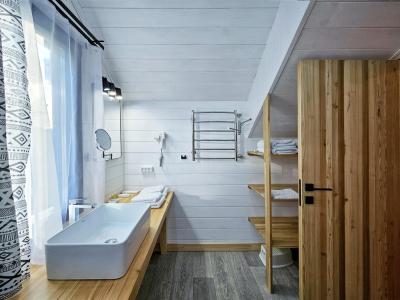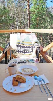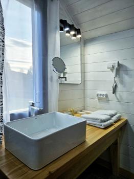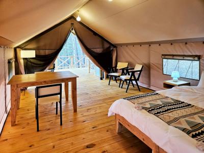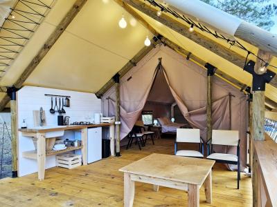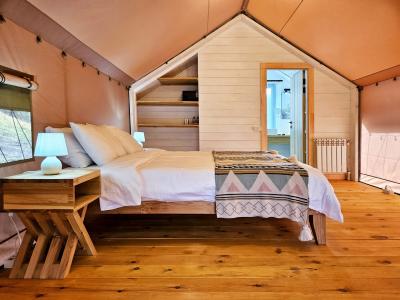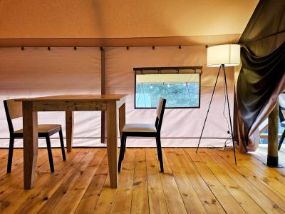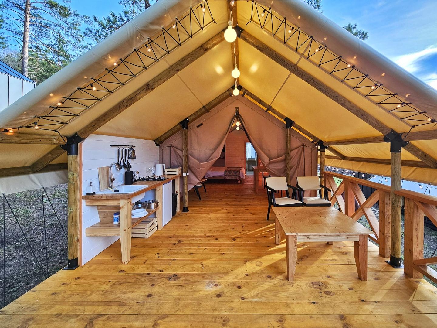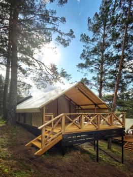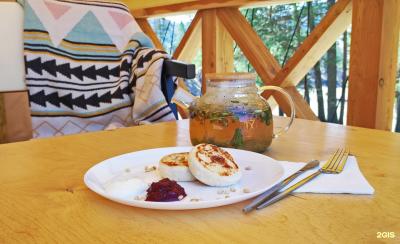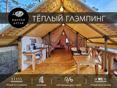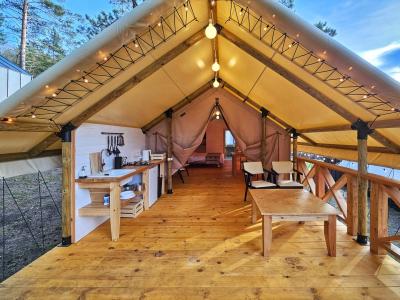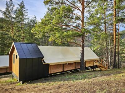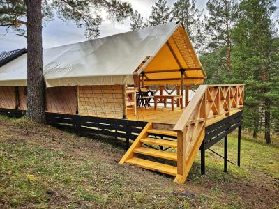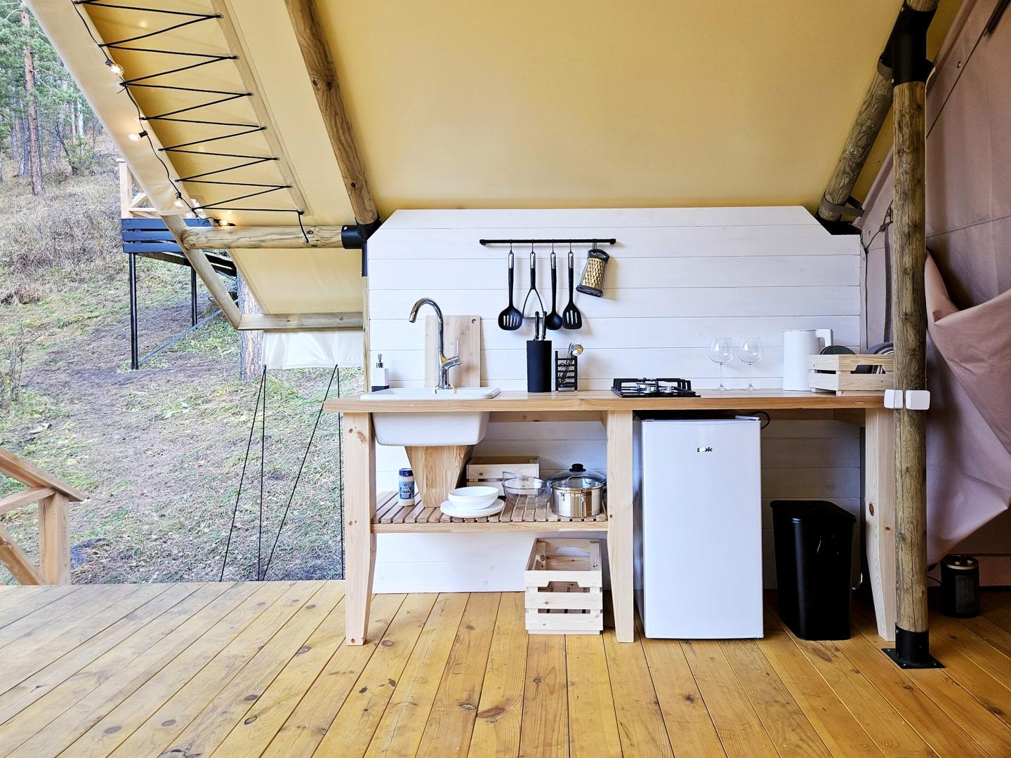 Для размещения гостей предлагается несколько летних благоустроенных домиков-шатров, в каждом из которых есть оборудованная кухня с обеденной зоной и санузел с душевой кабиной. Питьевая вода из скважины, сотовой связи нет, но есть бесплатный Wi-Fi.