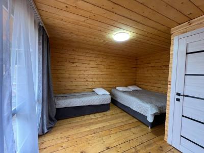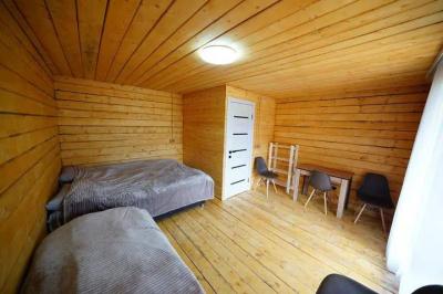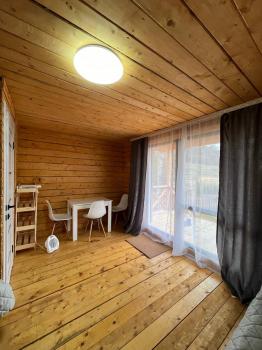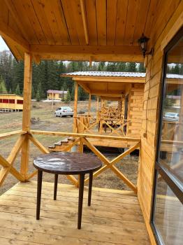 В домике имеется двуспальная и односпальная кровати, столик со стульями, обогреватель на случай холодной погоды. У каждого домика своя веранда со столиком. Санузел: унитаз, раковина, душ.