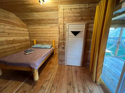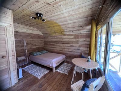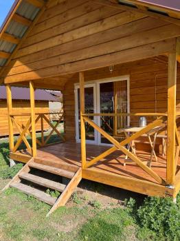 Для проживания предлагаются три домика с верандой и окнами в пол.