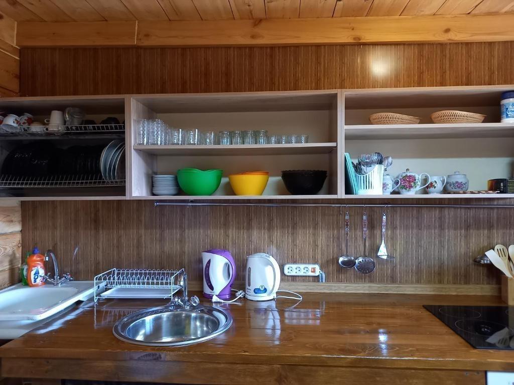 На территории имеется гостевая кухня для приготовления пищи, две большие террасы, детская площадка и большая поляна для активных игр, открытая терраса для отдыха на свежем воздухе, парковка для автомобилей, прачечная. В шаговой доступности находится продуктовый супермаркет. Разнообразить досуг можно настольными играми. Расстояние до берега озера Большое Яровое около 1,8 км.