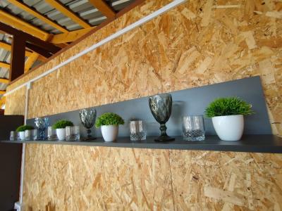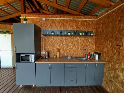 Газовая плита, холодильник, чайник, микроволновая печь, вся необходимая посуда, телевизор, детский уголок, столы и лавочки.