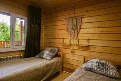 Санузел с душем. Отдельная спальня с двумя односпальными кроватями, в гостиной двуспальная кровать, есть кухонная зона (раковина, варочная панель, набор посуды), на террассе стол, скамейки, в придомовой зоне мангал.