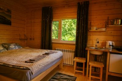 Дом с панорамным окном и террассой: две односпальные кровати трансформируются в двуспальную, душевая комната, холодильник, шкаф, набор посуды, чайник, индивидульный банный чан (опция), стол, скамейки, мангал. Стоимость проживания
