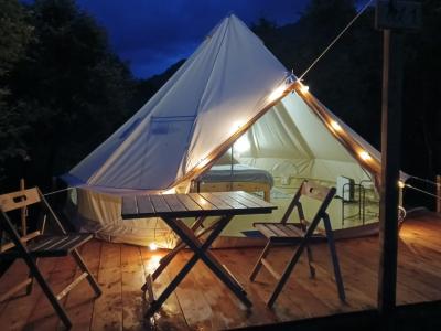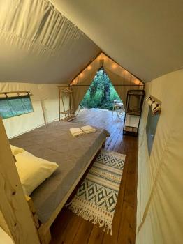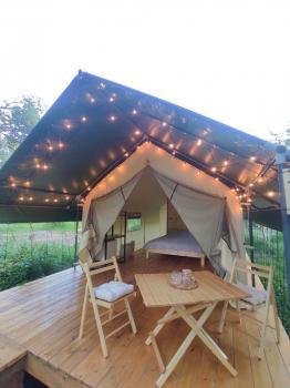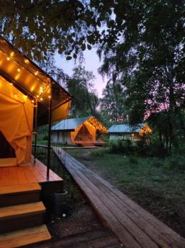 Комфортабельные палатки (5 шт), внутри душ, туалет, двуспальная кровать, матрац с подогревом, шкаф, холодильник, стол, стулья на террасе, шкаф. Одна палатка снабжена индивидуальным банным чаном. Стоимость палатки