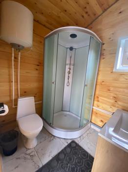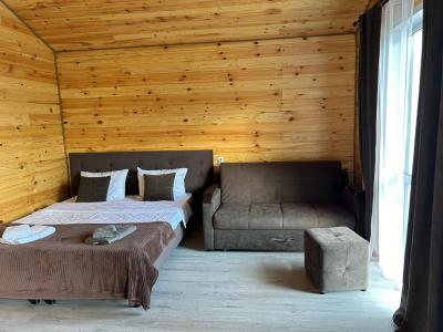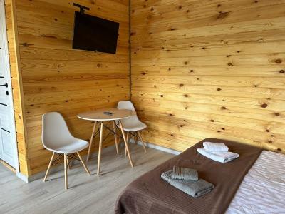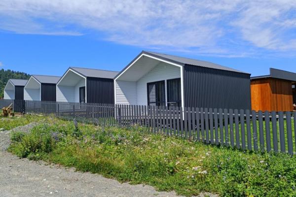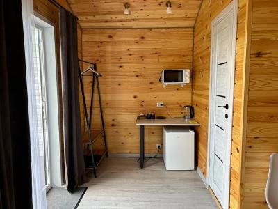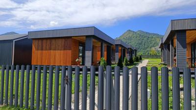 Каждый дом оснащен двуспальной кроватью(спринг бокс), большим диваном (140х200), вешалкой для одежды и обуви, кухонной зоной с необходимым набором посуды, чайником, микроволновкой и холодильником. Панорамные окна с видом на горы.