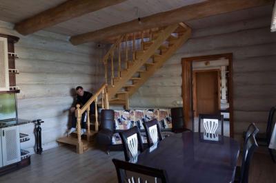 Двухэтажный коттедж построен из бревна сосны ручной обработки.