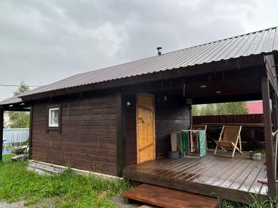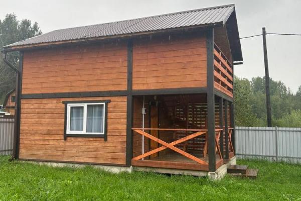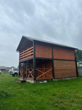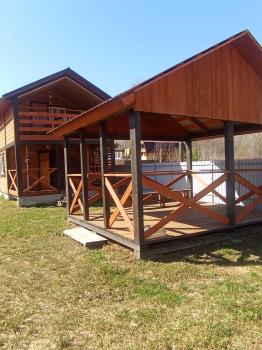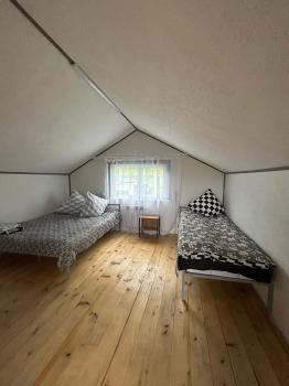 - Домик на 6 спальных мест. На первом этаже домика расположена кухня с чайником, микроволновкой, холодильником, есть необходимая посуда, телевизор, утюг.