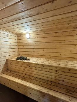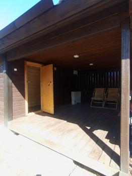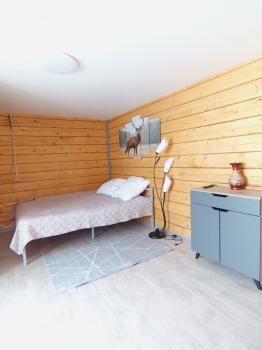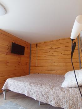 - Домик на 5 спальных мест. На первом этаже домика расположена кухня с чайником, микроволновкой, холодильником, есть необходимая посуда, телевизор, утюг.