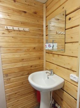 - В каждом домике санузел с душевой кабиной и стиральной машиной, с туалетными принадлежностями и зеркалом.