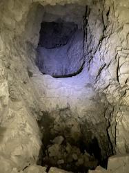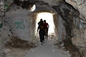 Длина штольни около 100 метров. Есть боковые короткие проходы. Под ногами камни, неровности, так что нужна обувь на плоской подошве.