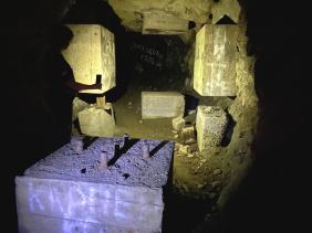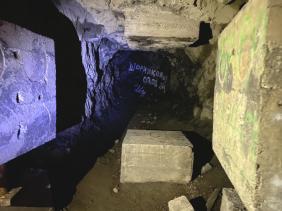 В нескольких местах можно увидеть цементные кубы в потоке, на полу и по бокам штольни. О предназначении этих кубов может сказать только специалист.