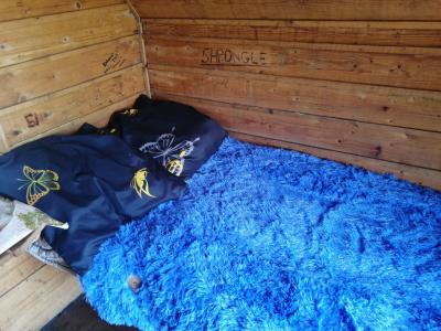 В бунгало две полутораспальные кровати, столик, полочки, вешалки, электричество.