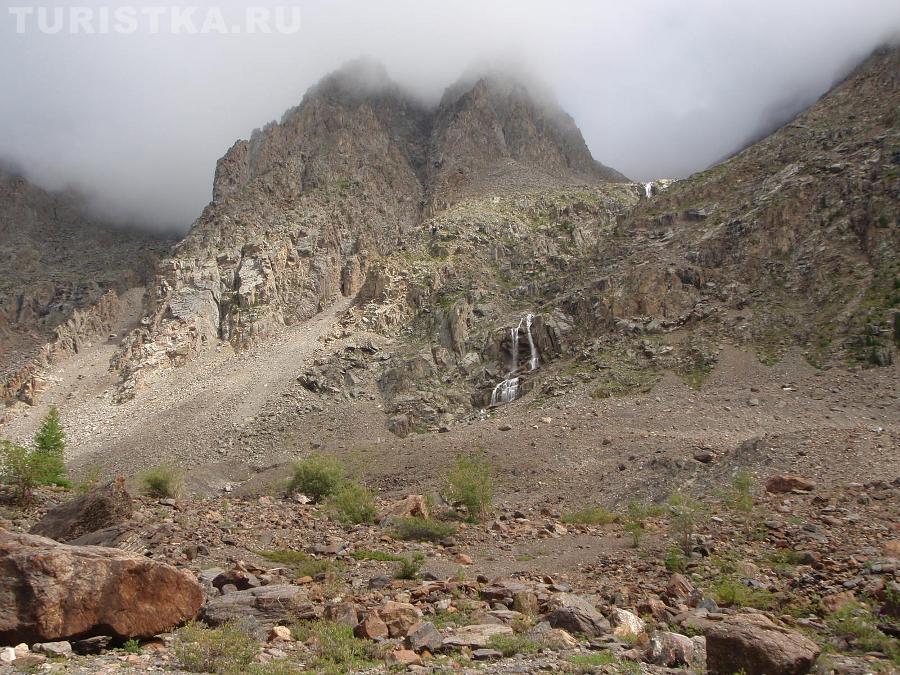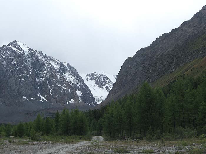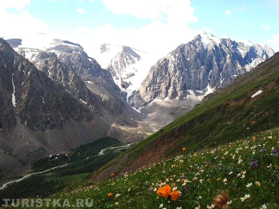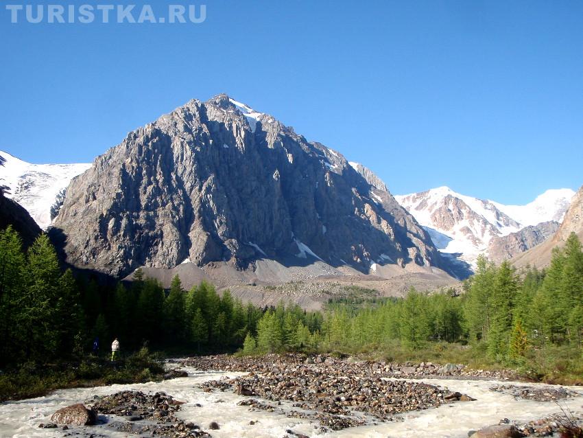 Справа и слева от нее видны белоснежные крылья ледники Большой и Малый Актру.