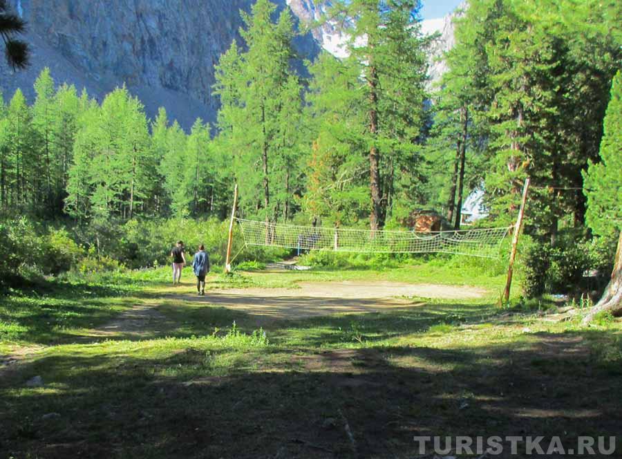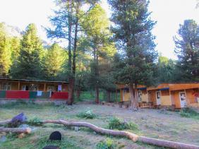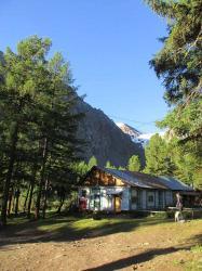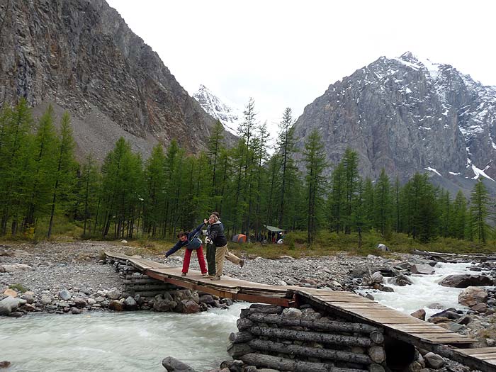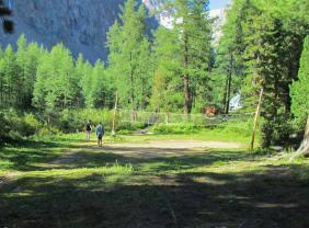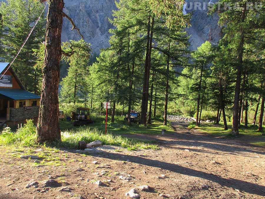 "Перевалка" (N50°08.685`, E87°48.6453`) это несколько домиков, 1 из которых с печкой, аил, баня. Высота 1750 м. Здесь можно переночевать, оставить свою машину и арендовать транспорт (УАЗ, ГАЗ-66, ЗИЛ-131) для доставки в альплагерь. Можно отправить только вещи, а самим прогуляться по очень живописной таежной тропе до долины реки, где она разделяется на несколько рукавов, а там вдоль реки Актру до альплагеря всего 8-10 км.