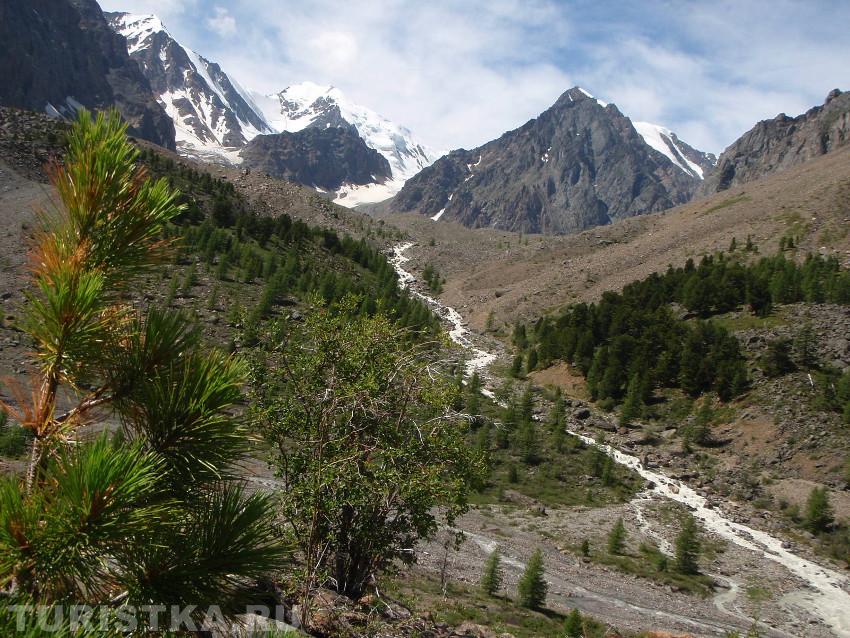 По дну ущелья течет бурная молочно-голубая река Актру, берега которой прячутся в кедрово-лиственничном лесу, растущем у подножия гор.