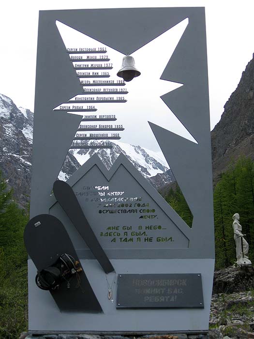 Здесь же в лесу установлены памятники альпинистке Галине Афанасьевой (в память всех погибших в этом районе альпинистов) и сибирякам-сноубордистам, разбившимся на вертолете в 2002 г. при попытке достичь Актру.