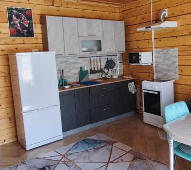 - Гостиная совмещённая с кухней, укомплектованной бытовой техникой и посудой