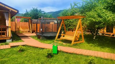 - Детская площадка, бассейн, батут, лавочки-качельки.