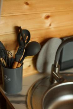 - укомплектованная кухонная зона ( посуда, чайник, горячая вода, плитка)