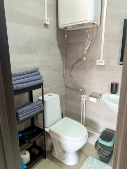Гостиная с диваном и ТV, кухонный гарнитур (посуда, столовые приборы, СВЧ печь, чайник, индукционная плита, холодильник). Обеденная зона. Санузел.