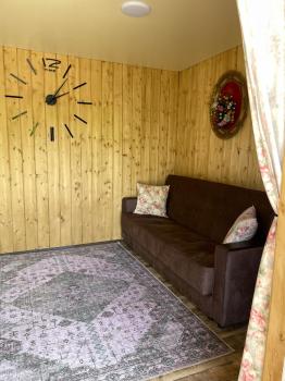 В доме гостиная с диваном и ТV, кухонный гарнитур (посуда, столовые приборы, холодильник,чайник, СВЧ печь, индукционная плита).