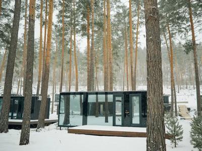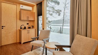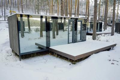 Каждый дом оснащен в соответствии с требованиями к отелям уровня 5*: дома оборудованы тёплыми полами, системой "умный дом", премиальный сантехникой, панорамными окнами.